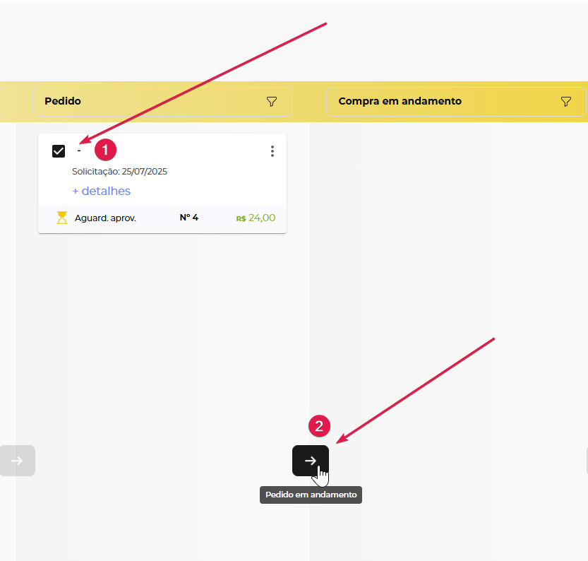 Com o pedido aprovado, basta selecionar quais compras serão efetuadas e clicar no botão "Pedido em andamento".