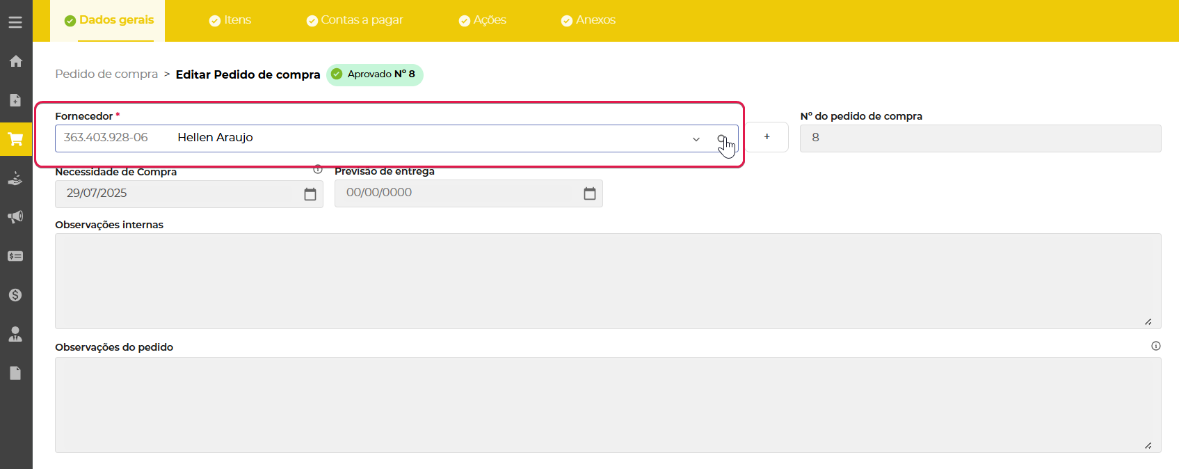 Após mover o pedido para compra em andamento você será levado para a tela de edição do pedido, onde deve selecionar o fornecedor.