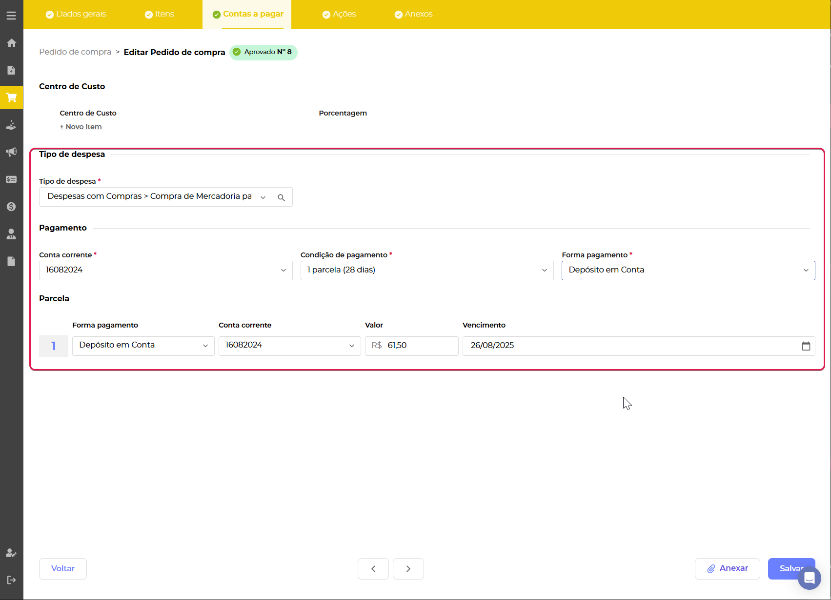 Na aba de contas a pagar você deve definir quais as tratativas financeiras essa compra deve considerar quando recebida.