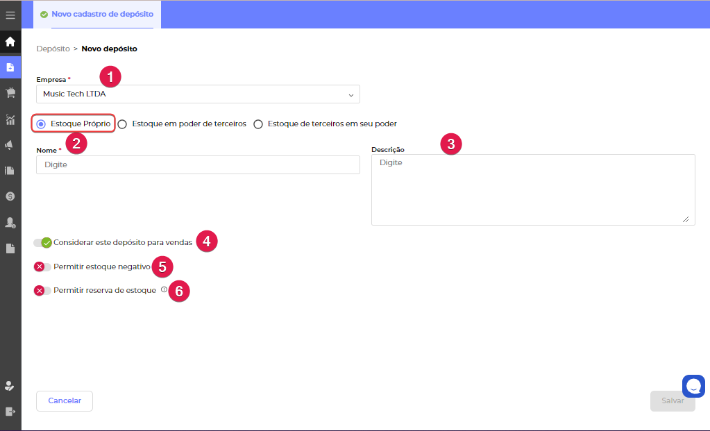 Nota Ao cadastrar sua empresa no sistema, um depósito padrão já é criado. |