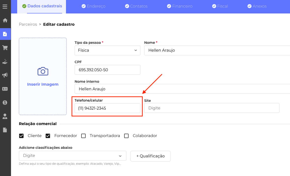 No cadastro de Parceiros, garanta que o telefone cadastrado tenha WhatsApp, pois o sistema envia as mensagens para este número: