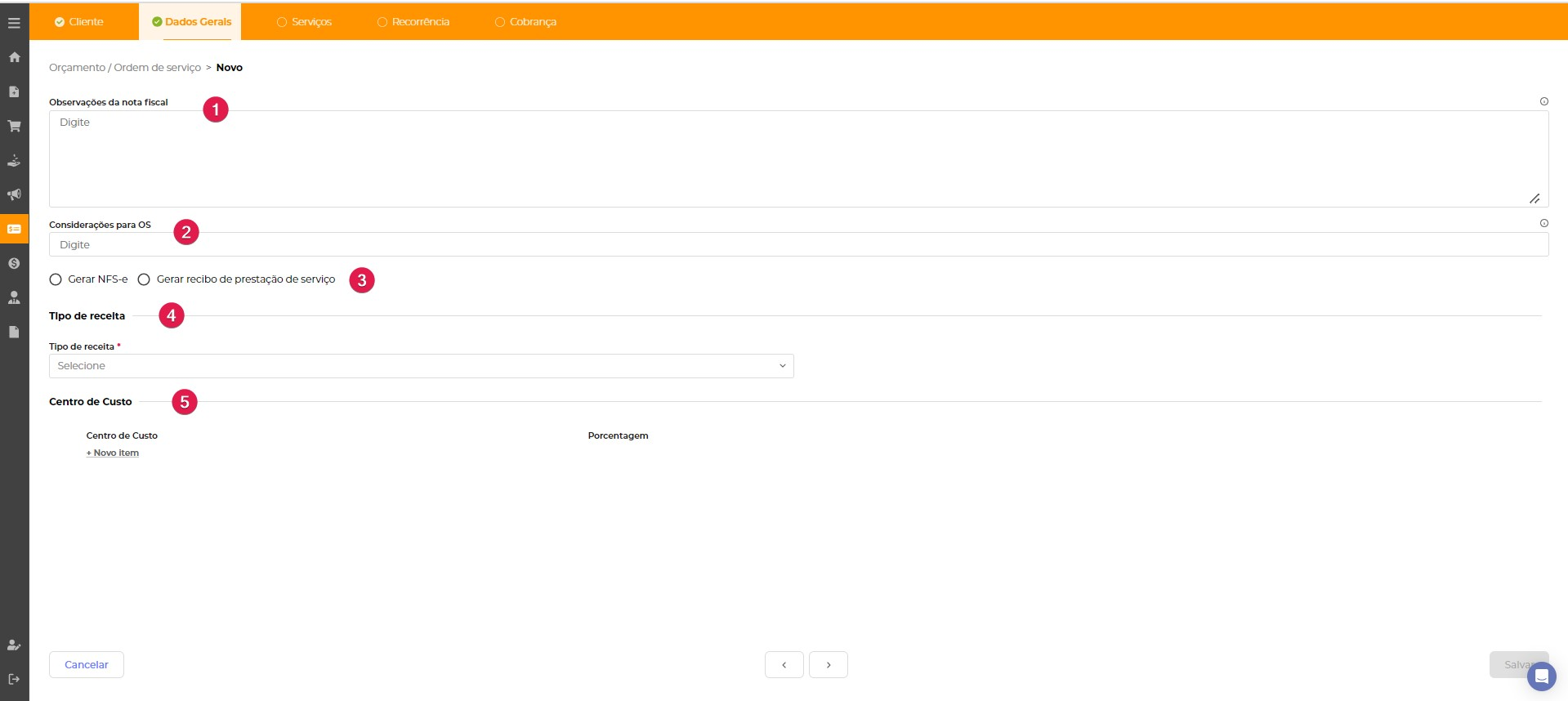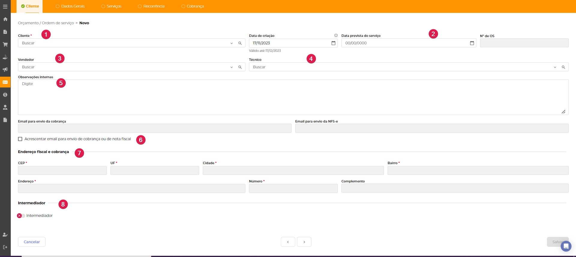 A Ordem de Serviços é dividida em abas para facilitar o preenchimento das informações necessárias para emissão da NFS-e ou Recibo.