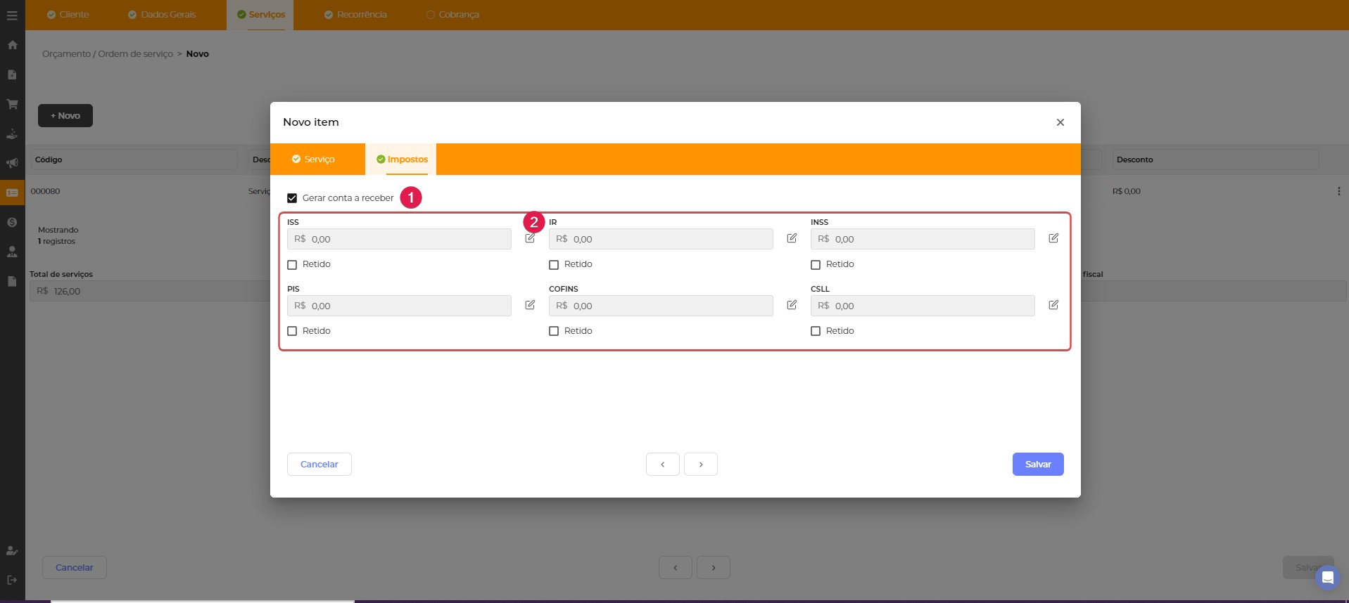 2. Impostos: o sistema irá considerar a configuração realizada no cadastro do serviço.