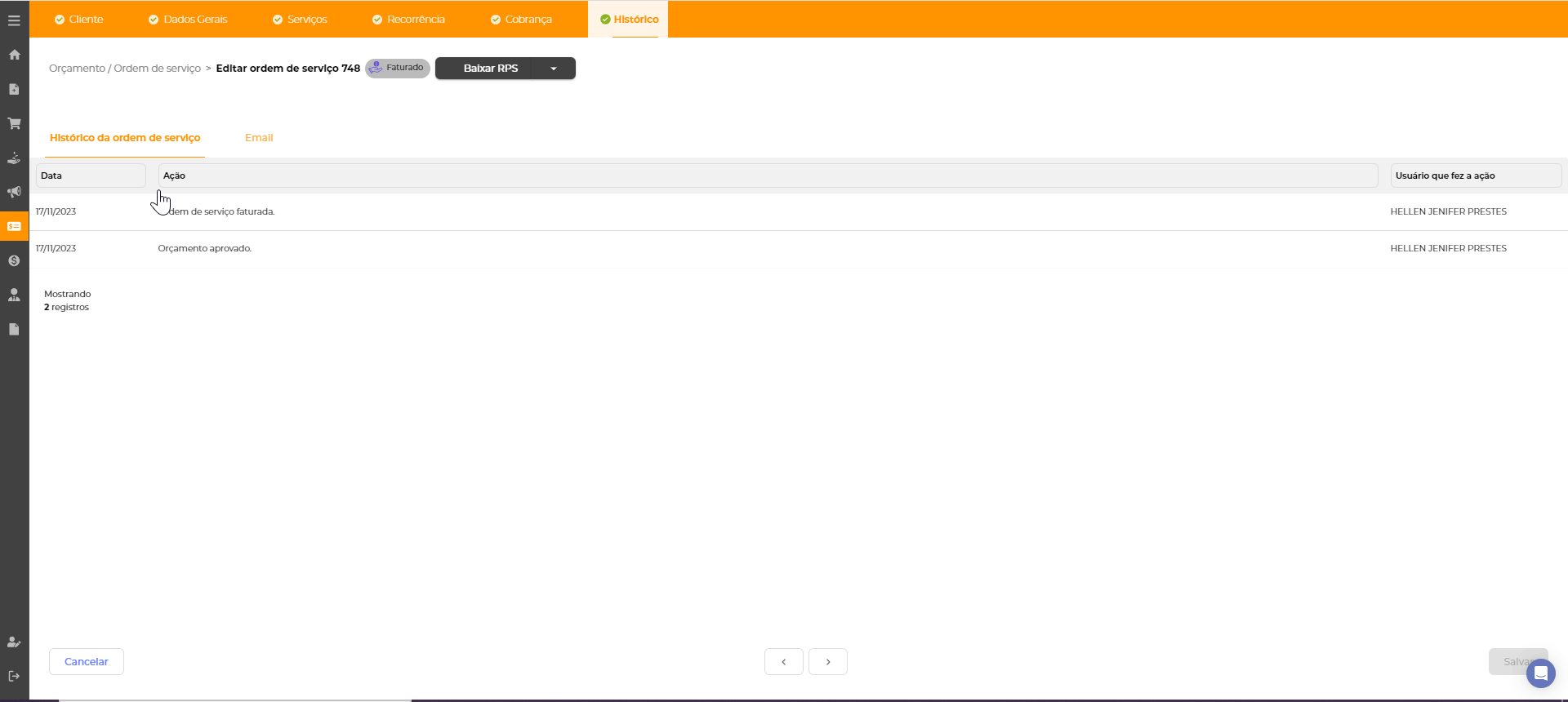 E na aba Histórico, demonstramos o histórico da Ordem de Serviços, os emails enviados com os orçamentos, alterações e informações do faturamento. A partir dessa etapa o sistema permite algumas ações como, Duplicar OS, Baixar OS, Baixar RPS ou NFS-e, Baixar XML e Cancelar OS ou NFS-e.