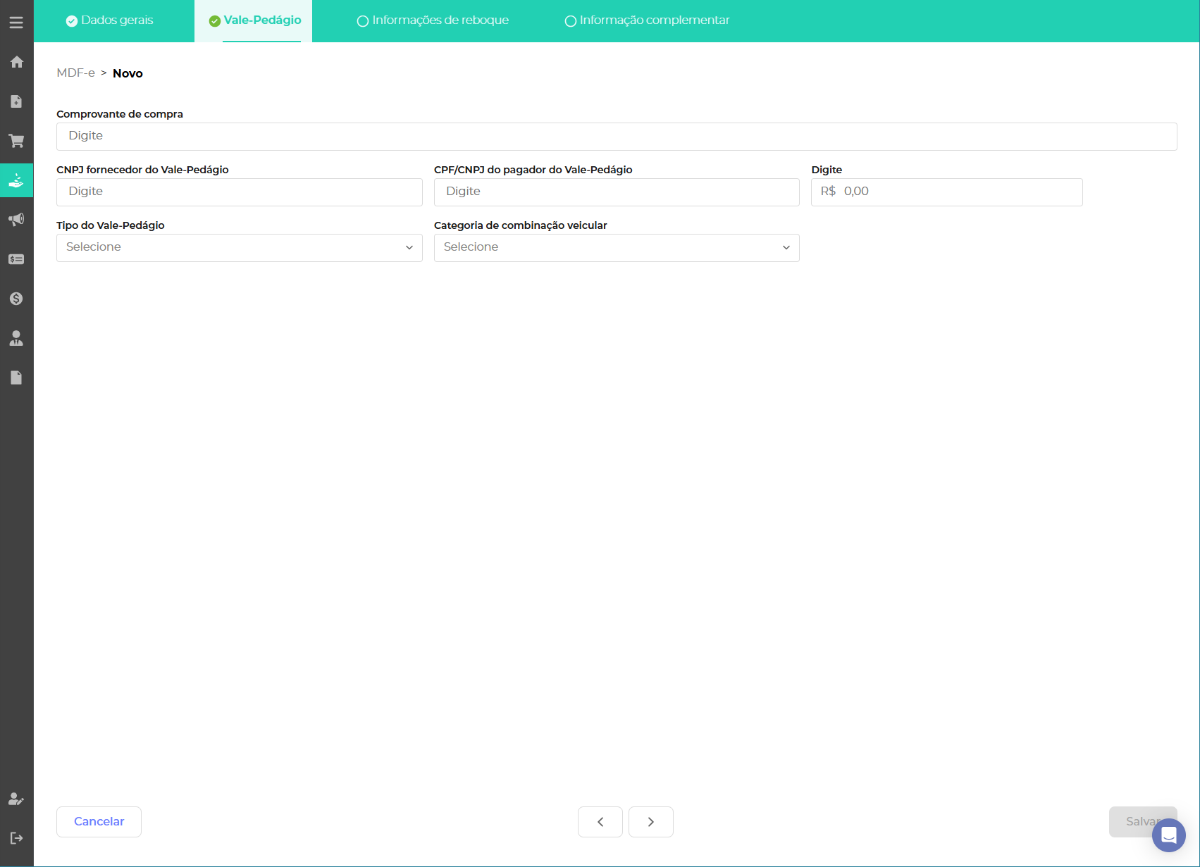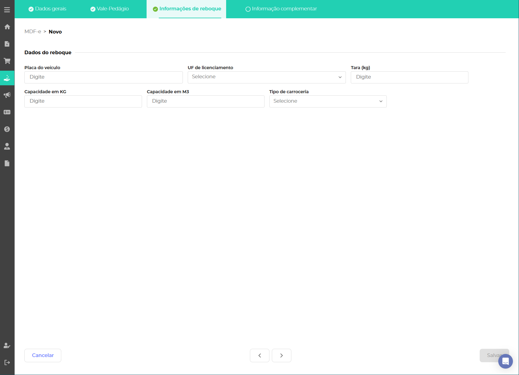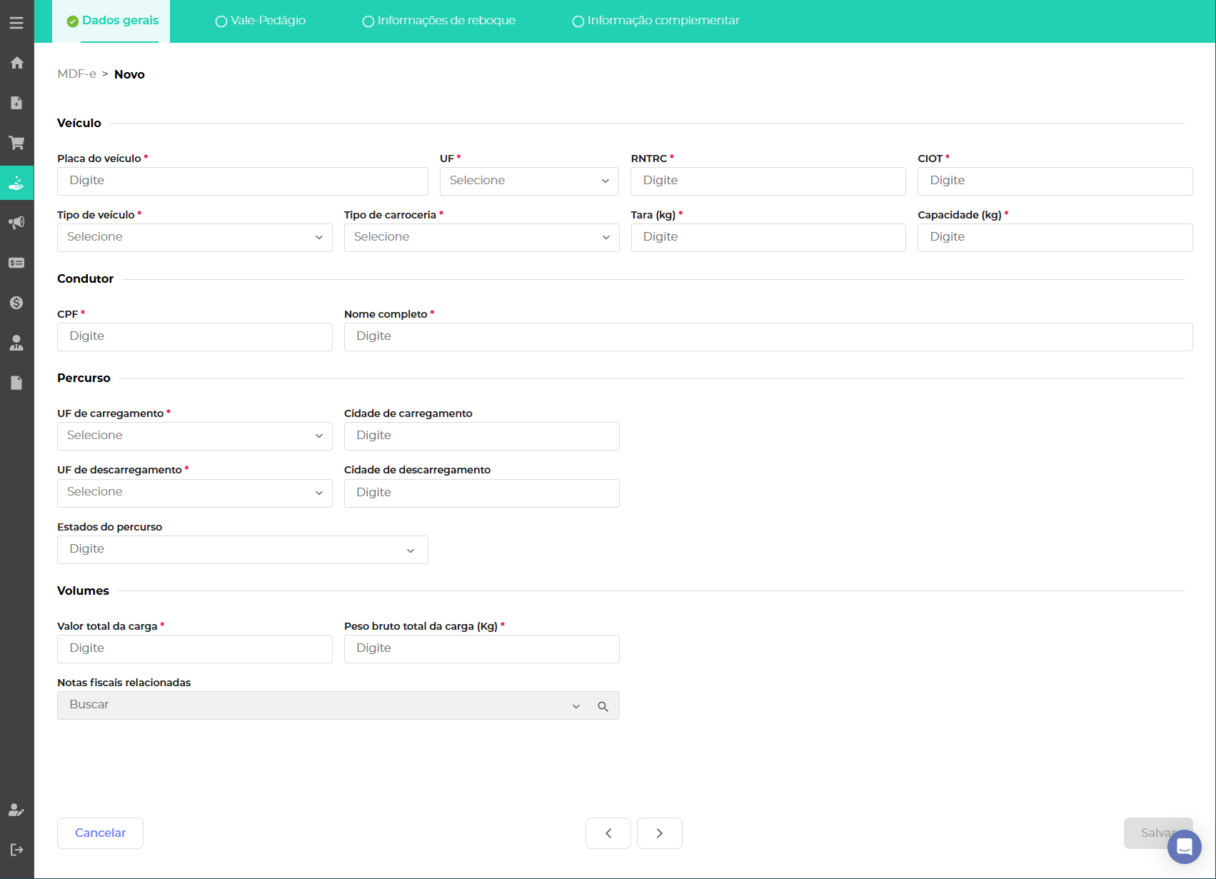 Ao clicar em novo é necessário preencher as informações obrigatórias relacionadas ao veículo, percurso e volumes na aba Dados Gerais.