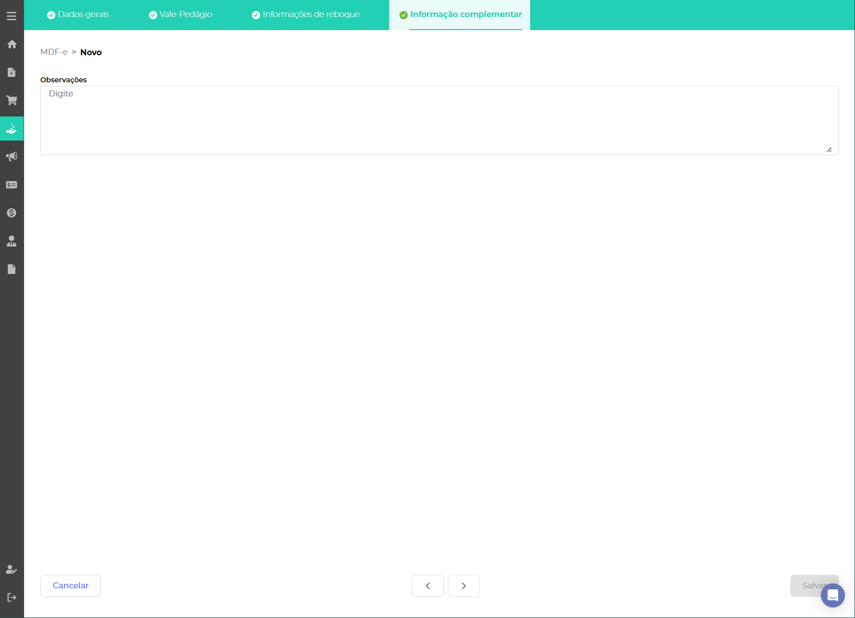 E em informações complementares fica disponível um campo de observações para a MDF-e.