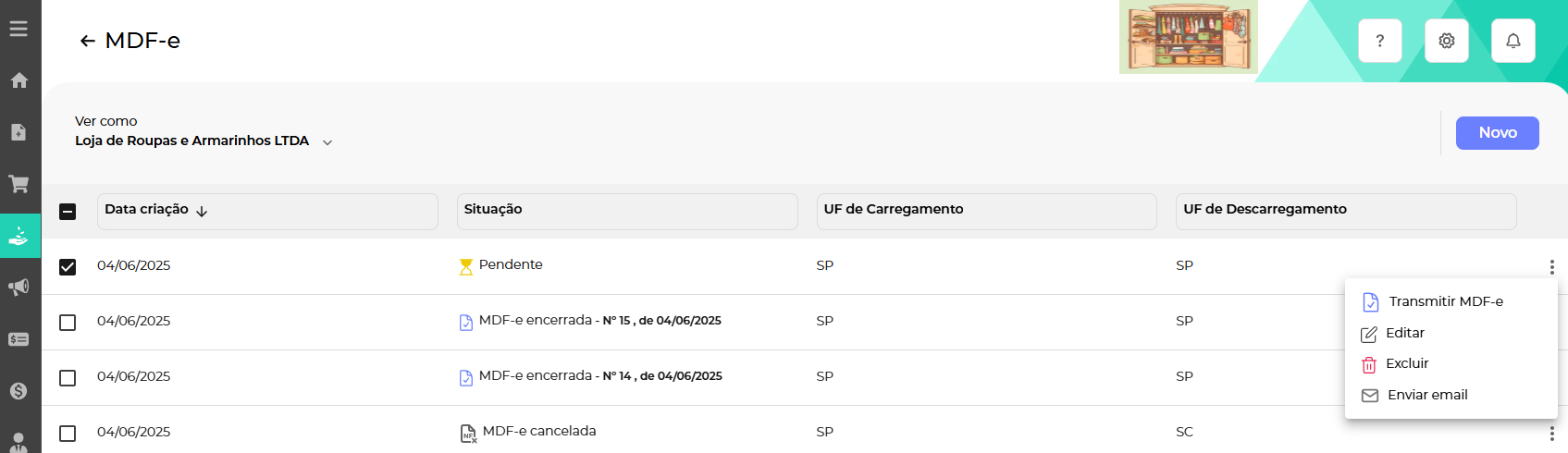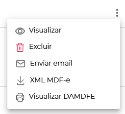 Clicando nos 3 pontos de uma MDF-e emitida conseguimos também baixar o XML, o DAMDFE e Encerrar a MDF-e