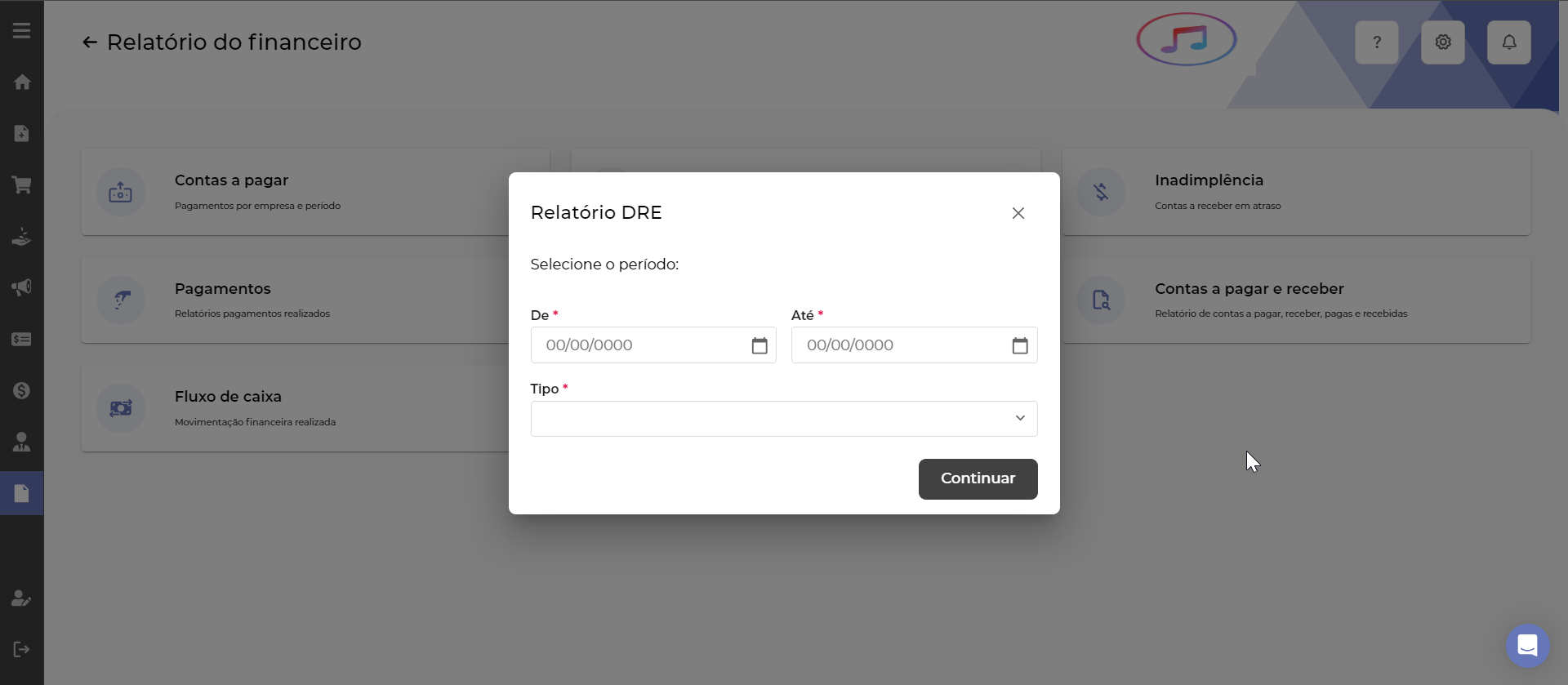 Para gerar o D.R.E dentro do Nuvy ERP vamos acessar o módulo de Relatórios > Financeiro > D.R.E