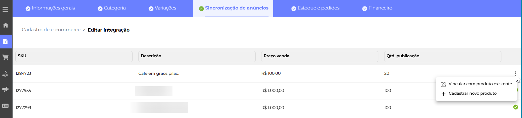 Ao acessar a aba Sincronização de anúncios você tem listado todos os produtos que estão anunciados no Nuvemshop.