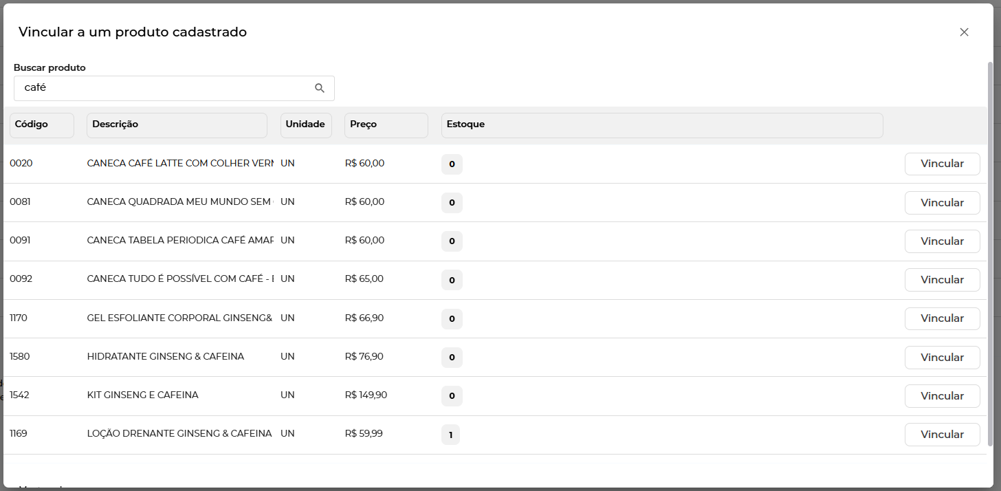 1 - Vincular a um produto existente: Aqui você pode buscar algum produto previamente cadastrado no Nuvy ERP e vincular esse produto do anúncio a ele.