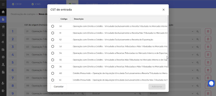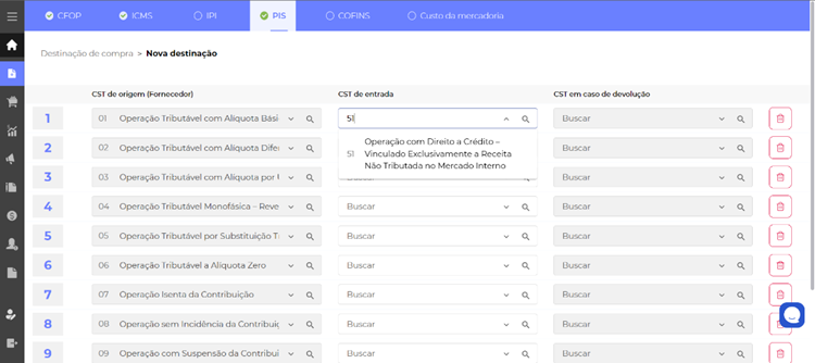 Quando acessamos a aba do PIS o sistema lista os possíveis CST de origem, que são informadas na nota do seu fornecedor.