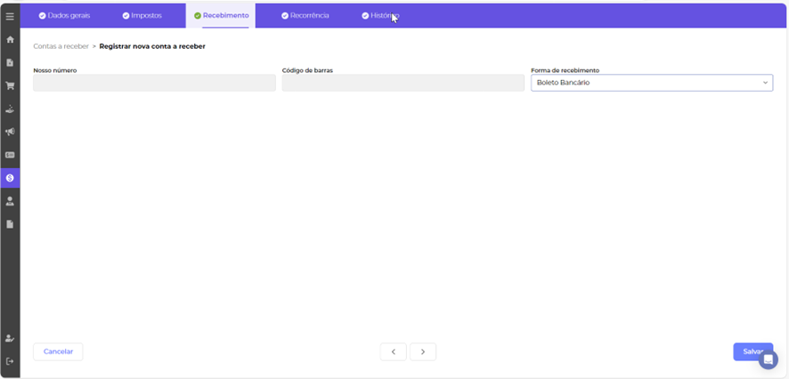 Na aba recebimento, deve informar a forma de recebimento > Boleto Bancário, preencher as demais abas e salvar.