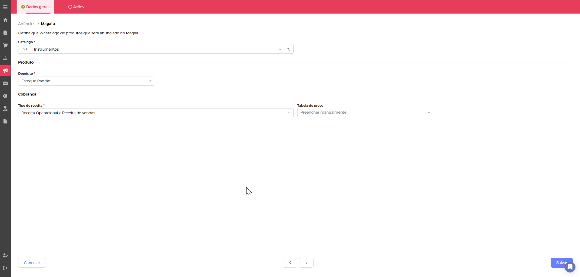 Ao definir o catálogo que será anunciado, os outros campos já serão preenchidos conforma a configuração realizada no cadastro do Magalu dentro do Nuvy.