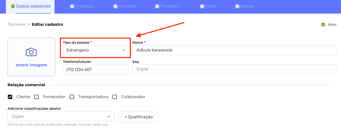 1. No Cadastro de Parceiros, coloque o Tipo de pessoa como "Estrangeiro":
