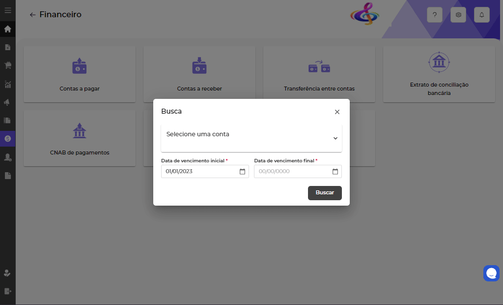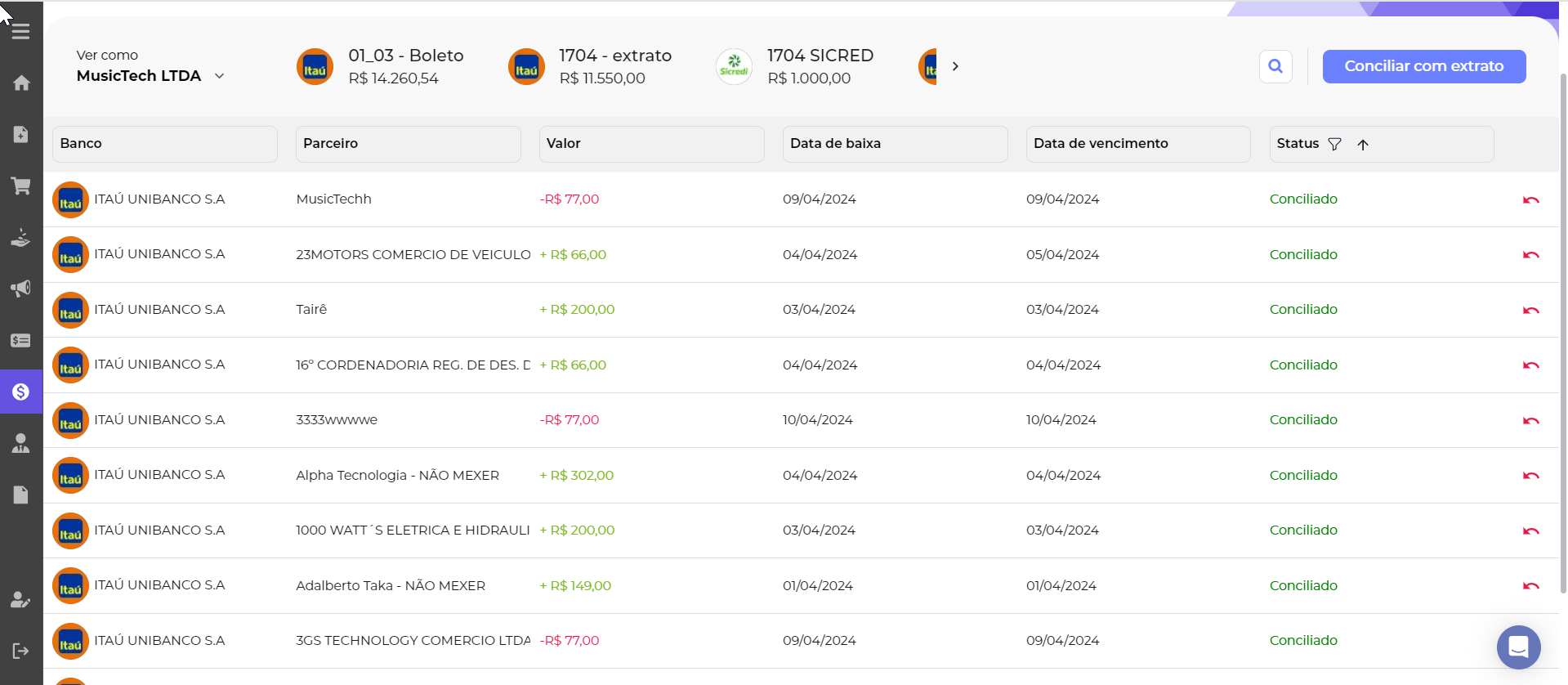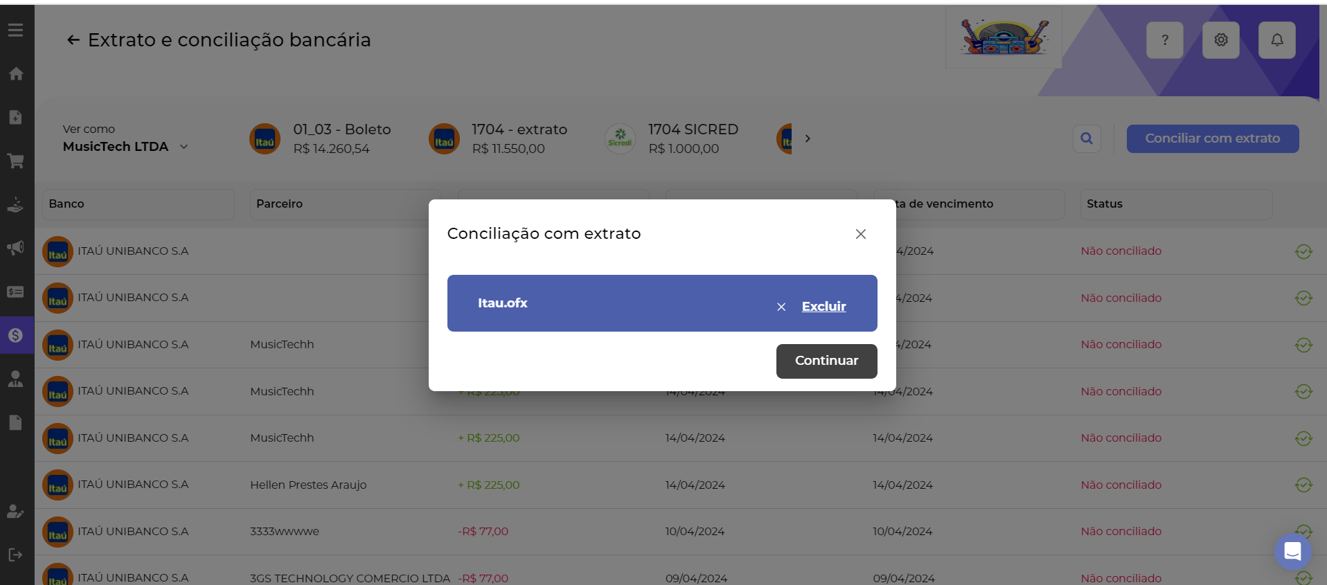 Ao acessar o Financeiro > Extrato de conciliação bancária