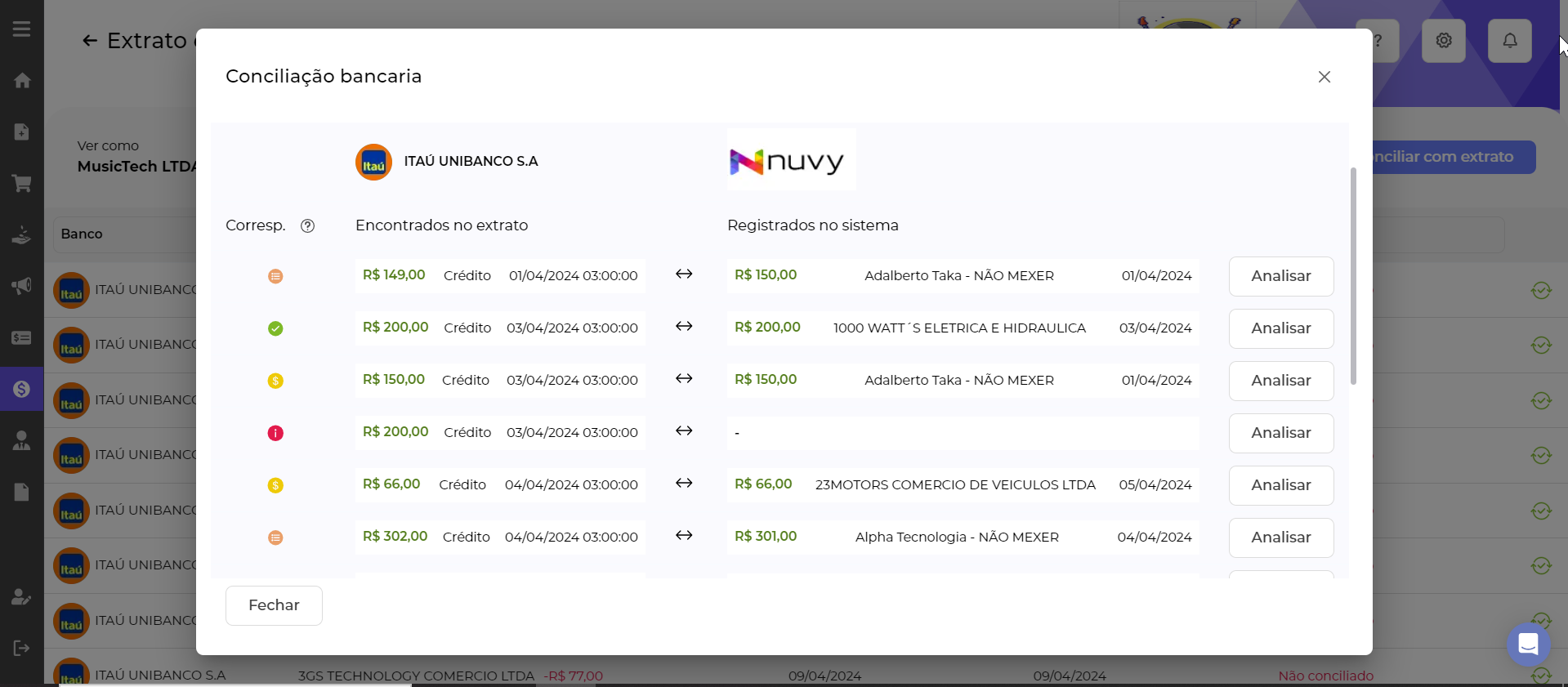 Para ajudar na identificação de cada lançamento o sistema informa a correspondência do extrato e sistema, assim fica mais fácil de entender o que se trata cada lançamento.