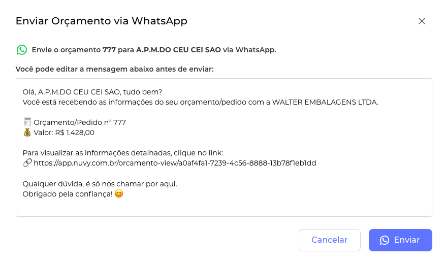 O Nuvy abrirá uma tela onde é possível personalizar o texto de envio. Como seu WhatsApp já está integrado ao Nuvy ERP, basta enviar.