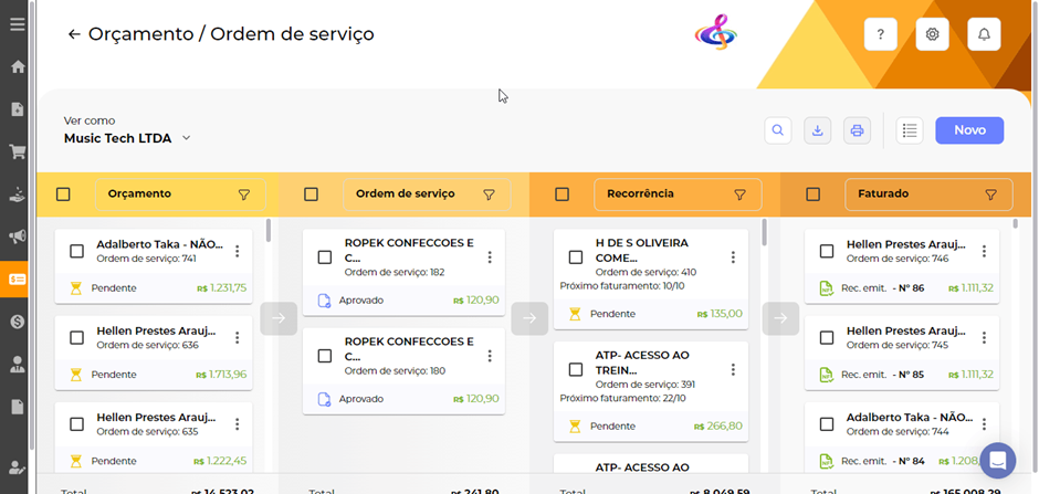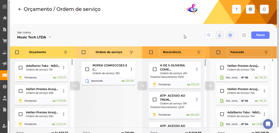Quando chegar o momento de emitir a nota fiscal ou recibo do seu serviço, o Nuvy ERP disponibiliza dois caminhos para sua operação, pelo kanban ou lista (dependendo da sua visualização de preferência).