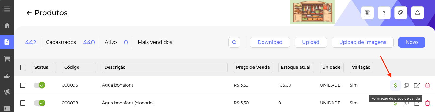 Acesse o cadastro de Produtos e clique no símbolo $: