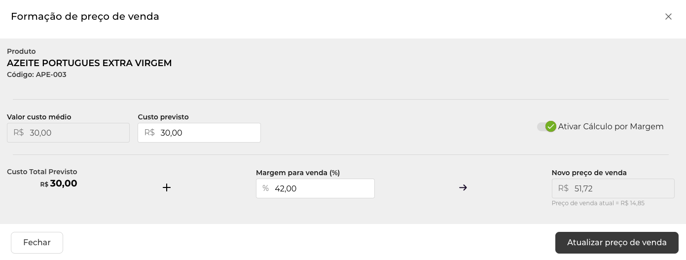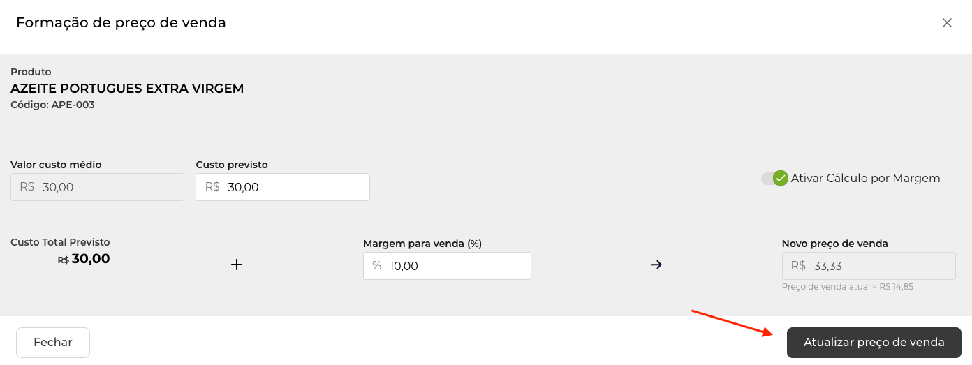 7. Finalize: Clique em "Atualizar preço de venda" para aplicar o novo valor ao cadastro.