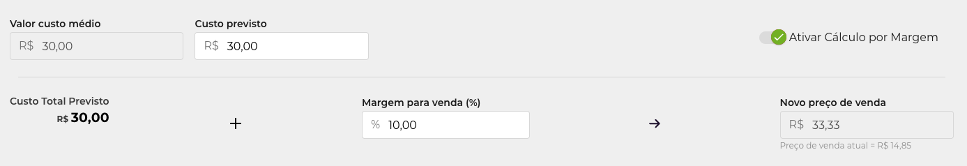 • Exemplo: Para um produto com custo de R$ 30,00 e Margem de 10%, o sistema projeta o preço para garantir que 10% do faturamento dessa venda seja lucro.