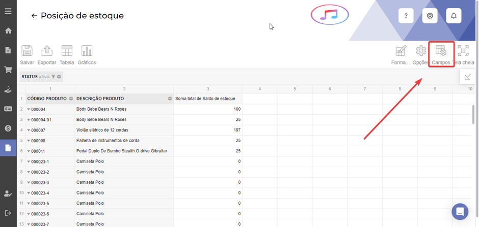 O relatório será criado em um modelo padrão, trazendo as principais informações sobre posição de estoque como status, código e descrição do produto, entre outras. Podendo ser personalizado para atender a necessidade da sua operação, basta clicar na opção “Campos” que você pode adicionar novas colunas relacionadas aos dados do estoque detalhado.