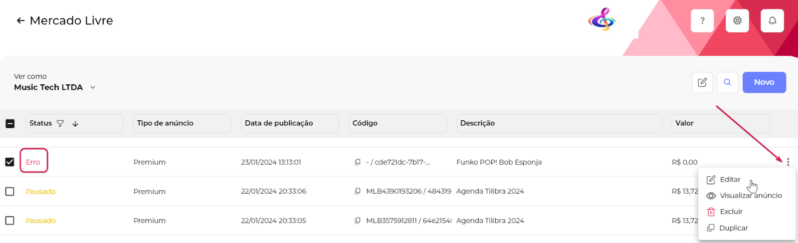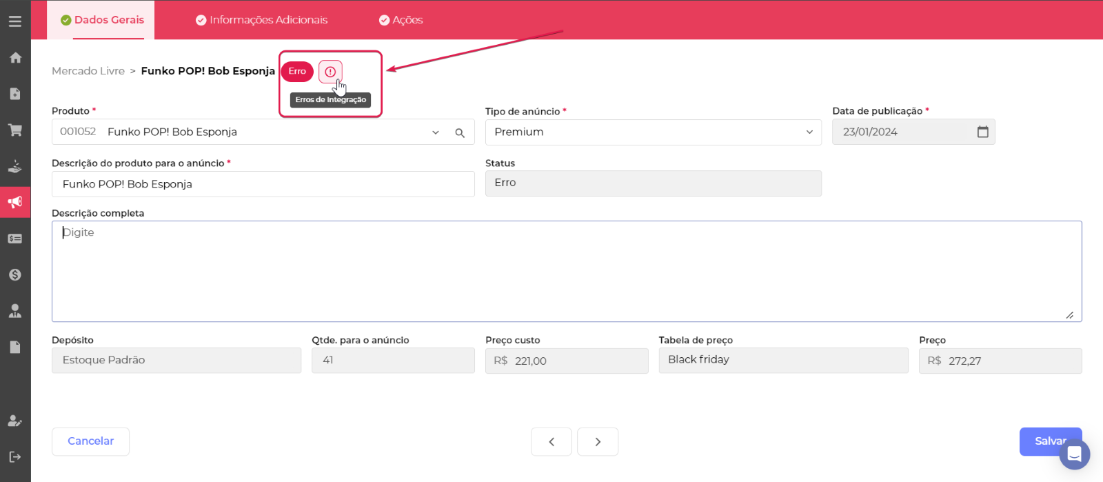 Durante a sincronização dos anúncios é possível que ocorram erros que são informados pelo Mercado Livre, para identificar esses erros basta acessar o anúncio que contém o status Erro.