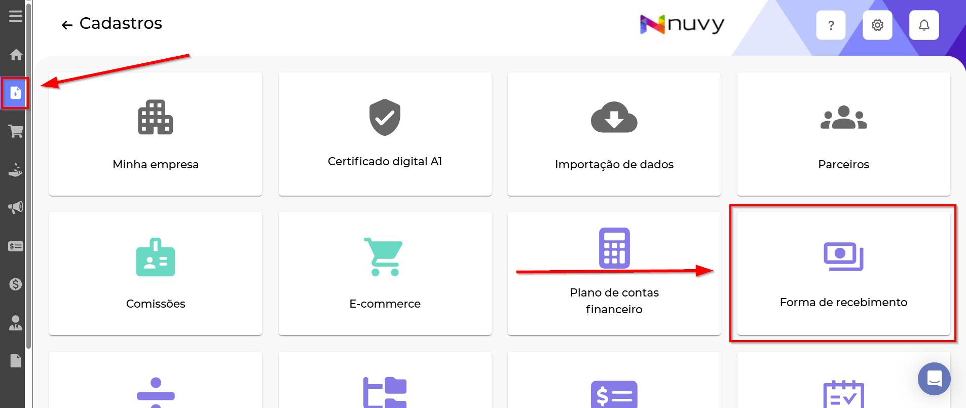 O Nuvy ERP oferece flexibilidade total na gestão das suas Formas de Recebimento (Dinheiro, Cartão de Crédito, PIX, Boleto, etc.).
