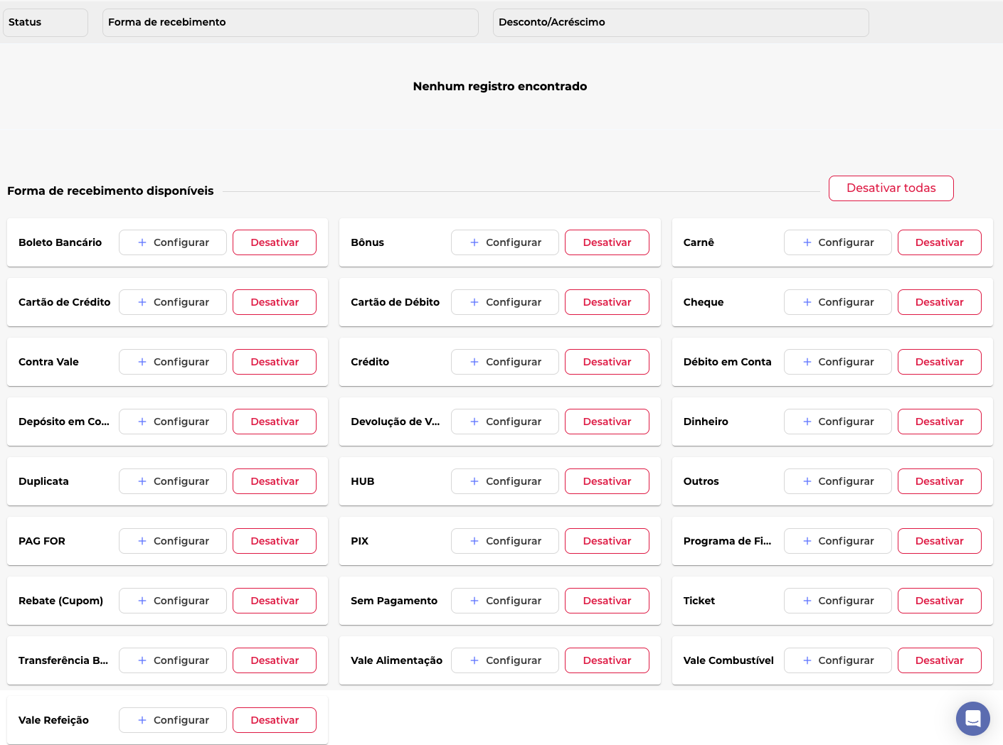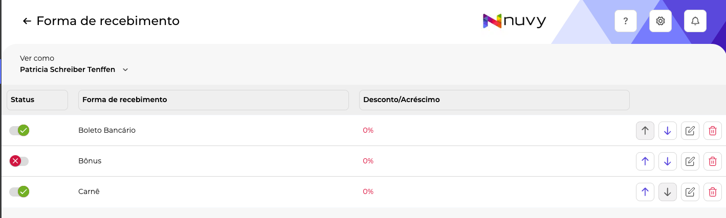 Ativar/Desativar: Você pode ligar ou desligar a chave ao lado de cada forma de recebimento para alterar o Status. Desative aquelas que sua empresa não utiliza para simplificar o processo de vendas.
