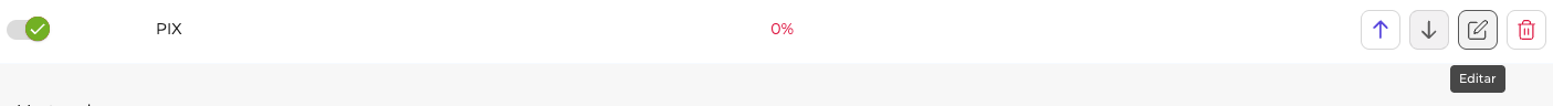 Editar: Clique no ícone de Editar para configurar regras de desconto ou acréscimo de valores, além dos Adquirentes.