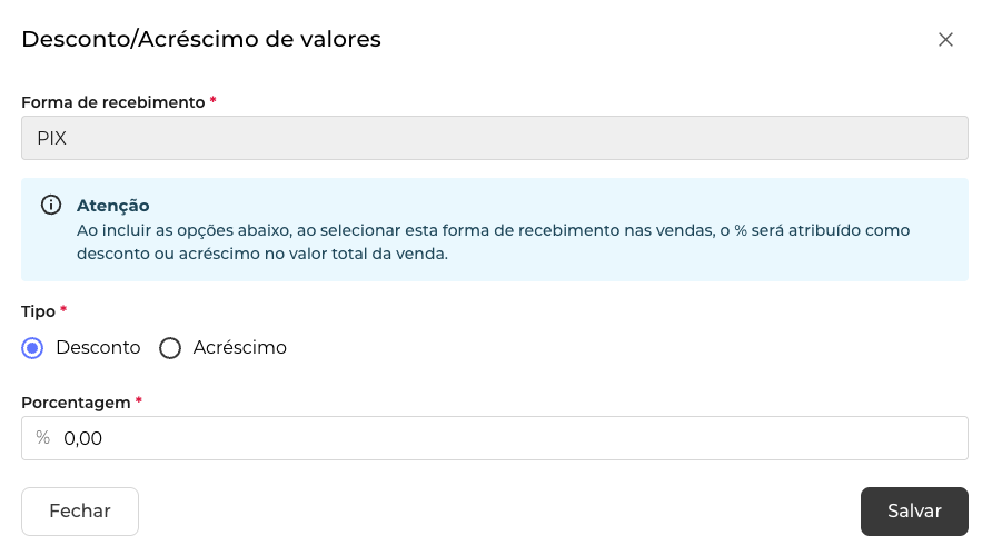 Esta funcionalidade permite que você aplique regras de preço específicas para cada forma de recebimento (ex: dar um desconto para pagamento em PIX ou aplicar um acréscimo para parcelamento no cartão).