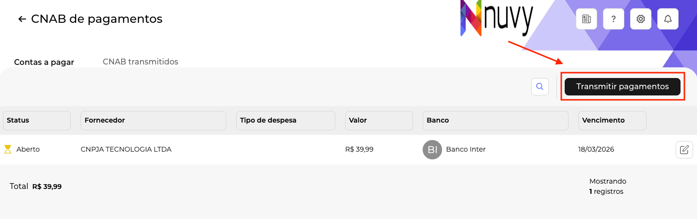 Com isso o sistema vai listar todos os títulos que podem ser transmitidos (aqueles que possuem os códigos de barras e a flag de CNAB de pagamentos ativada). Clique em Transmitir pagamentos:
