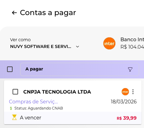 Assim que a remessa é gerada, o status do título muda para "Aguardando CNAB" e permanece na coluna a pagar. Isso indica que a instrução de pagamento já foi criada, mas a efetivação ainda depende do banco.