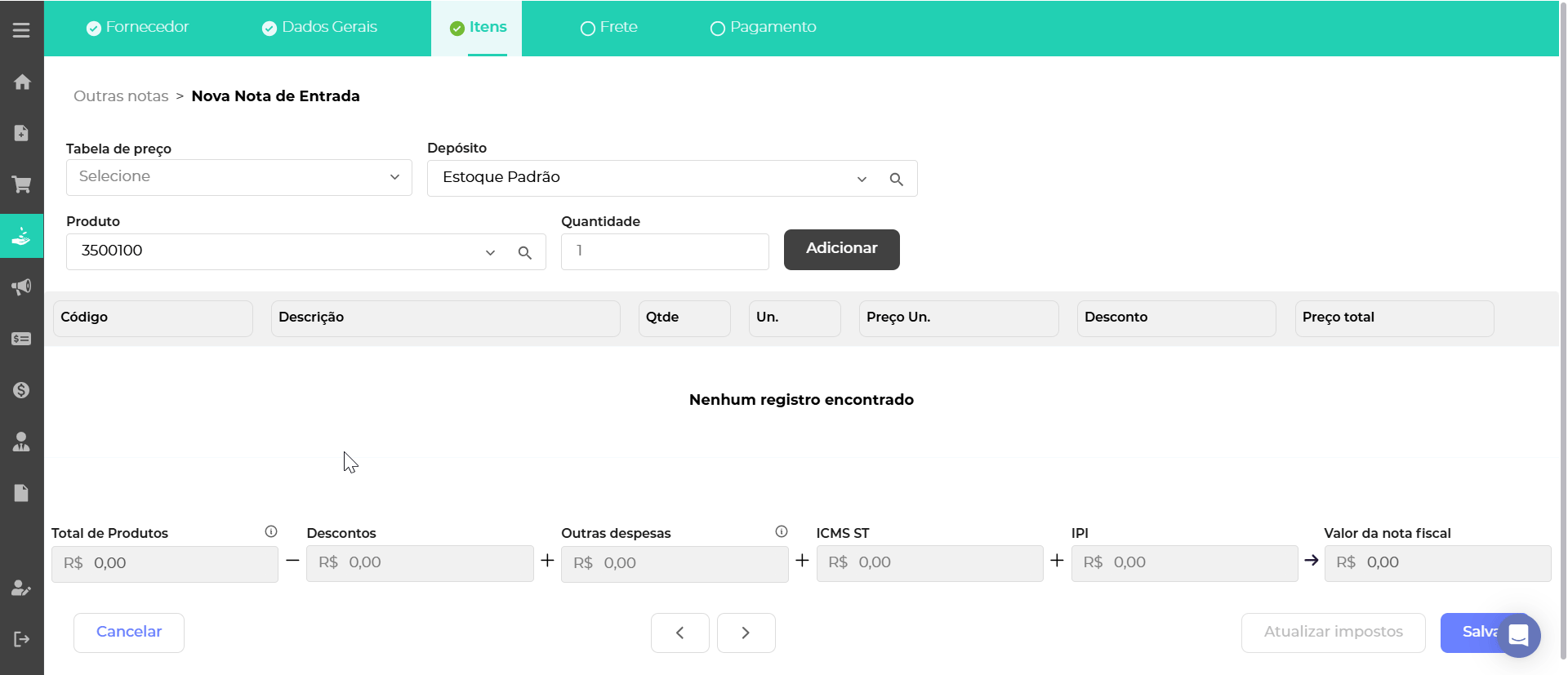 Na aba Itens, insira os produtos que farão parte desta Nota de Entrada, selecionando o depósito, produto e em seguida preencha a quantidade:
