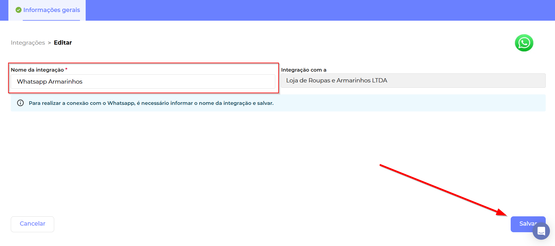 Em Informações Gerais, dê um nome para a sua integração e depois clique em salvar: