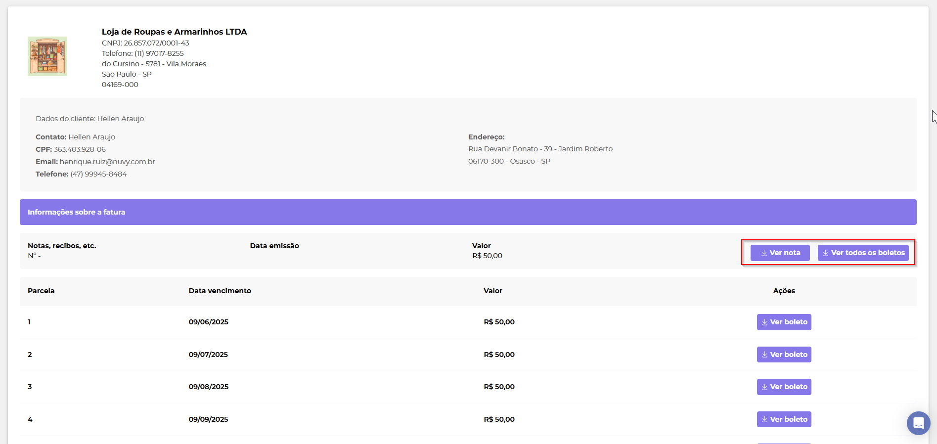 A seguir, mostramos alguns exemplos. O cliente recebe as principais informações, como número da nota, recibo, data de emissão e valor da conta. Além disso, há um link que direciona para uma página exclusiva, a Central de Faturas, onde ele pode baixar o boleto e a Nota Fiscal ou recibo emitido.
