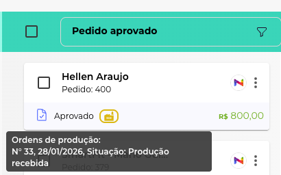 Status em Tempo Real: Ao passar o mouse sobre o ícone de fábrica no card do pedido, você verá o número da OP, a data de início e a situação atual (ex: "Produção recebida").