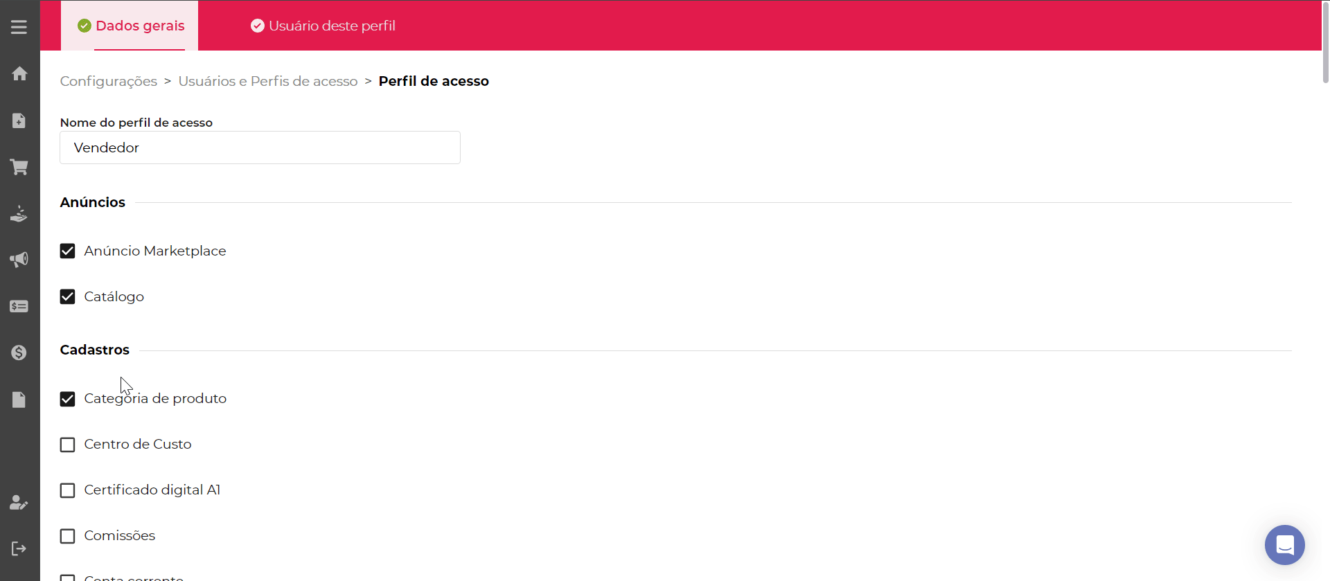 Nesta tela, você verá todas as definições já atribuídas a esse perfil, basta adicionar ou remover as marcações que deseja editar.