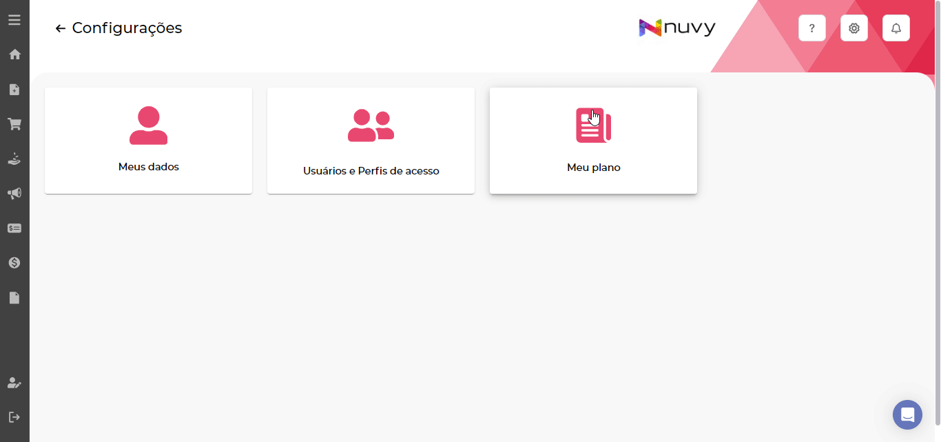 Para acessar e conferir todos os dados do plano contratado é muito simples, pois no Nuvy ERP todas as informações podem ser consultadas em um único lugar, basta acessar Configurações > Meu plano: