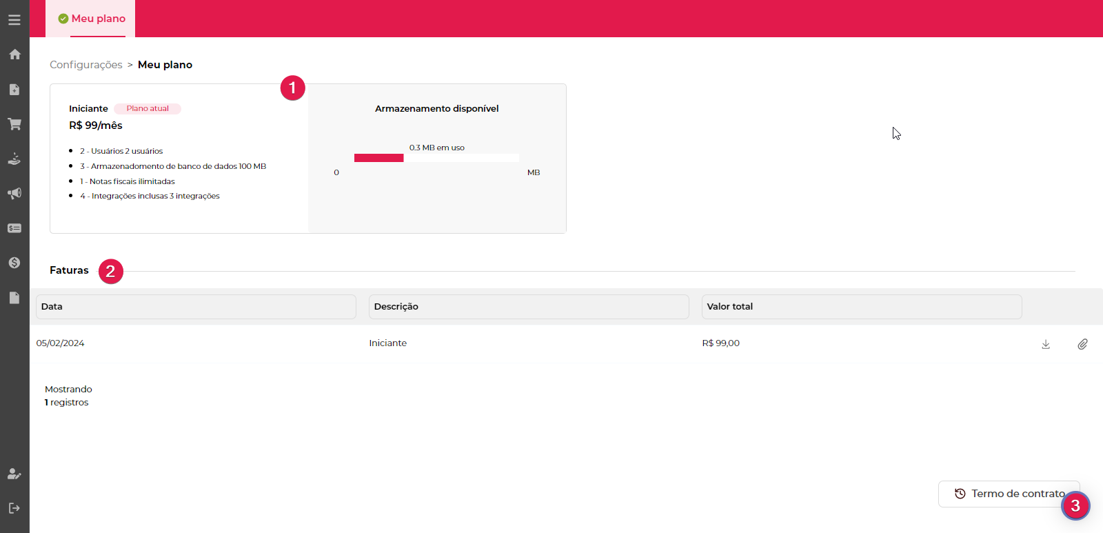 Plano atual -> Aqui você pode verificar todas as características do plano selecionado, lembrando que a qualquer momento é possível fazer uma melhoria, basta entrar em contato com nossa equipe para conhecer os planos e escolher a opção que melhor se enquadra para você e sua empresa;