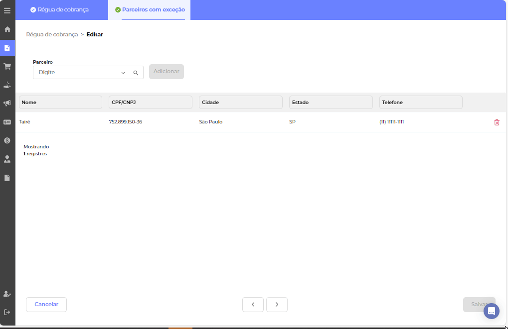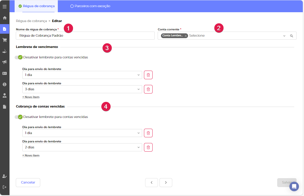 Aqui você pode criar uma exceção por parceiro, ou seja, selecionar os parceiros que não receberão os lembretes dessa régua de cobrança.
