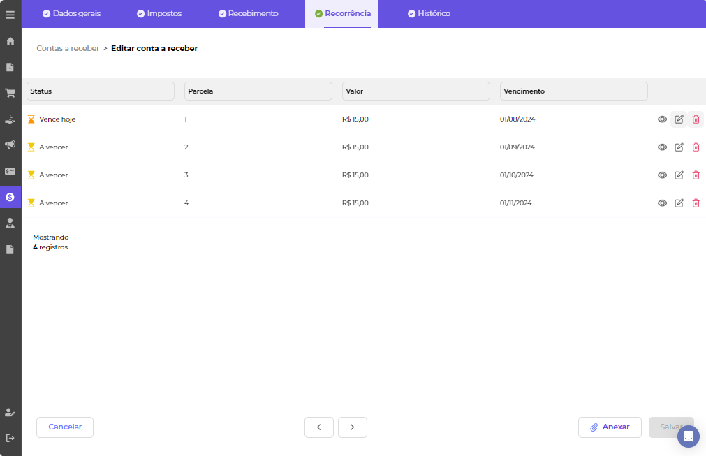 Na aba recorrência você deve informar os dados para a geração das contas a receber e em seguida deve salvar a operação.