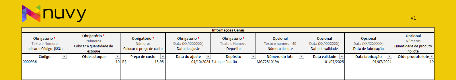 Para os produtos com lote e validade já cadastrados no Nuvy, basta informar o número do lote, a validade além da quantidade que deseja atualizar; já para o lote que não estiver cadastrado, você deve informar todos os campos da planilha para que o sistema considere como um novo cadastro de lote.
