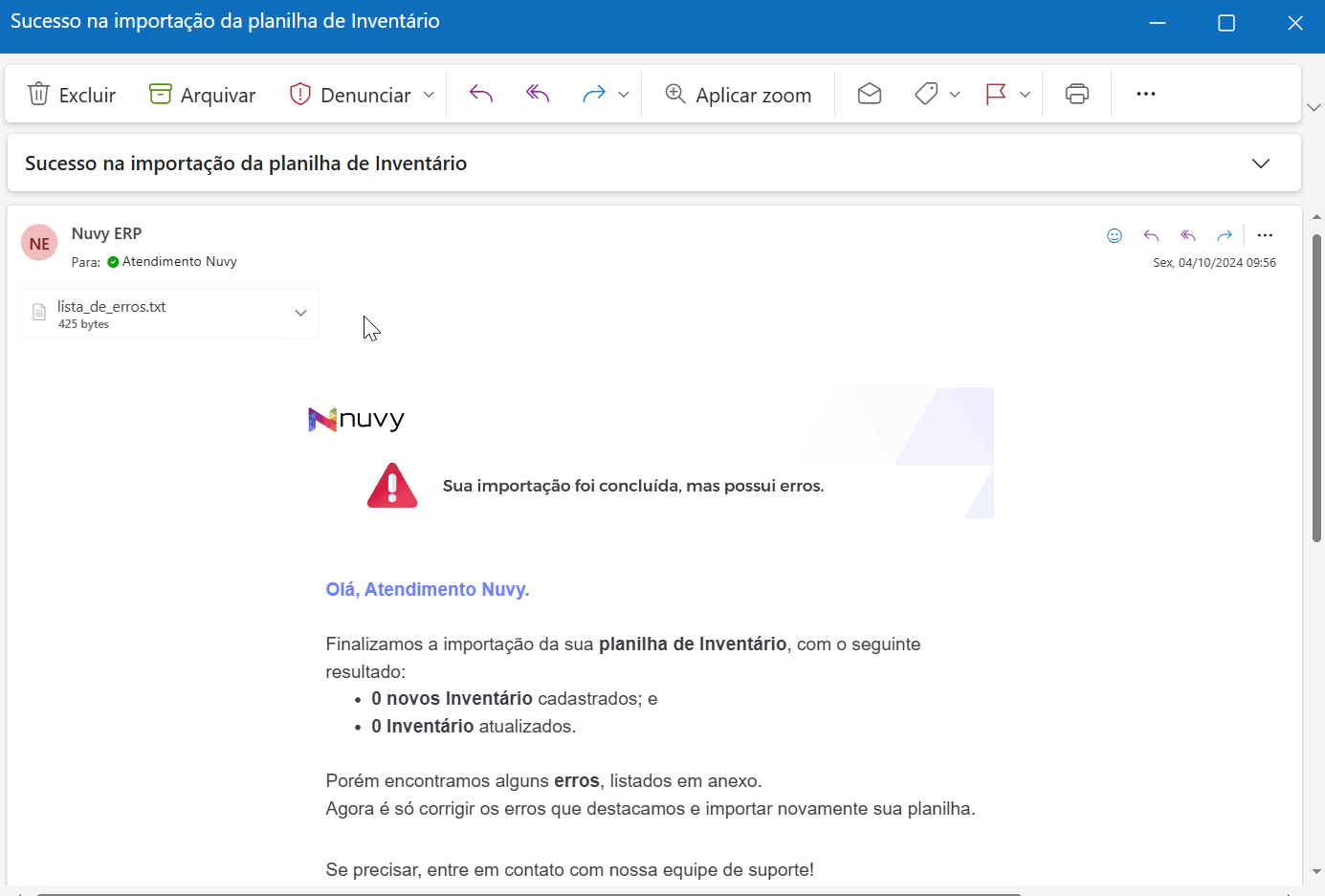 Você irá receber um e-mail para saber quantos produtos foram atualizados e se caso houver algum erro na sua importação, ele será explicado no arquivo em anexo.